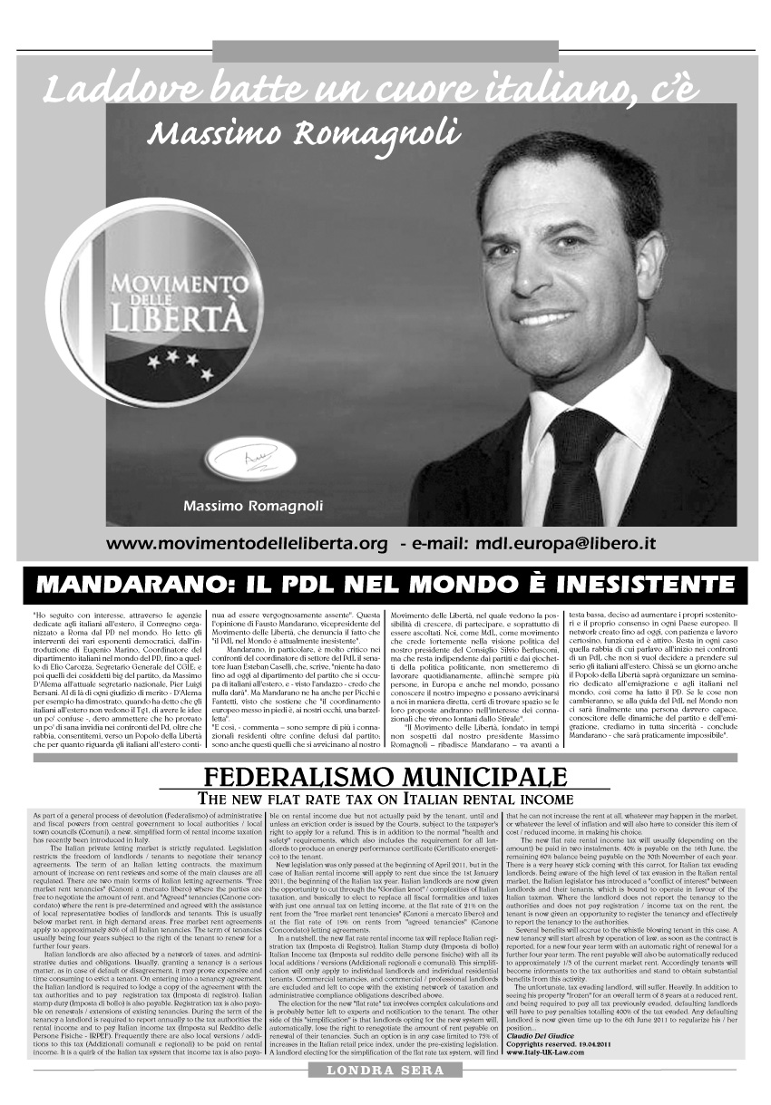 | MANDARANO: IL PDL NEL MONDO È INESISTENTE "Ho seguito con interesse, attraverso le agenzie dedicate agli italiani all'estero, il Convegno organizzatoa Roma dal PD nel mondo. Ho letto gli interventi dei vari esponenti democratici, dall'introduzione di Eugenio Marino, Coordinatore del dipartimento italiani nel mondo del PD, fino a quello di Elio Carozza, Segretario Generale del CGIE; e poi quelli dei cosiddetti big del partito, da Massimo D'Alema all'attuale segretario nazionale, Pier Luigi Bersani. Al di là di ogni giudizio di merito - D'Alema per esempio ha dimostrato, quando ha detto che gli italiani all'estero non vedono il Tg1, di avere le idee un po' confuse -, devo ammettere che ho provato un po' di sana invidia nei confronti del Pd, oltre che rabbia, consentitemi, verso un Popolo della Libertà che per quanto riguarda gli italiani all'estero continua ad essere vergognosamente assente". Questa l'opinione di Fausto Mandarano, vicepresidente del Movimento delle Libertà, che denuncia il fatto che "il PdL nel Mondo è attualmente inesistente". Mandarano, in particolare, è molto critico nei confronti del coordinatore di settore del PdL il senatore Juan Esteban Caselli, che, scrive, "niente ha dato fino ad oggi al dipartimento del partito che si occupa di italiani all'estero, e - visto l'andazzo - credo che nulla darà". Ma Mandarano ne ha anche per Picchi e Fantetti, visto che sostiene che "il coordinamento europeo messo in piedi è, ai nostri occhi, una barzelletta". "E così, - commenta – sono sempre di più i connazionali residenti oltre confine delusi dal partito; sono anche questi quelli che si avvicinano al nostro Movimento delle Libertà, nel quale vedono la possibilità di crescere, di partecipare, e soprattutto di essere ascoltati. Noi, come MdL, come movimento che crede fortemente nella visione politica del nostro presidente del Consiglio Silvio Berlusconi, ma che resta indipendente dai partiti e dai giochetti della politica politicante, non smetteremo di lavorare quotidianamente, affinchè sempre più persone, in Europa e anche nel mondo, possano conoscere il nostro impegno e possano avvicinarsi a noi in maniera diretta, certi di trovare spazio se le loro proposte andranno nell'interesse dei connazionali che vivono lontani dallo Stivale". "Il Movimento delle Libertà, fondato in tempi non sospetti dal nostro presidente Massimo Romagnoli – ribadisce Mandarano – va avanti a testa bassa, deciso ad aumentare i propri sostenitori e il proprio consenso in ogni Paese europeo. Il network creato fino ad oggi, con pazienza e lavoro certosino, funziona ed è attivo. Resta in ogni caso quella rabbia di cui parlavo all'inizio nei confronti di un PdL che non si vuol decidere a prendere sul serio gli italiani all'estero. Chissà se un giorno anche il Popolo della Libertà saprà organizzare un seminario dedicato all'emigrazione e agli italiani nel mondo, così come ha fatto il PD. Se le cose non cambieranno, se alla guida del PdL nel Mondo non ci sarà finalmente una persona davvero capace, conoscitore delle dinamiche del partito e dell'emigrazione, crediamo in tutta sincerità - conclude Mandarano - che sarà praticamente impossibile". |